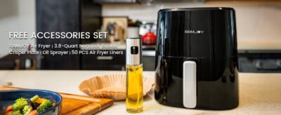 • FREE ACCESSORIES SET: Come with RAMJOY air fryer, 3.8-quart nonstick basket, crisper plate, oil sprayer, and 50 pcs disposable air fryer liners. A FREE must-have air fryer accessories set to keep the basket clean and bring you convenient cooking.